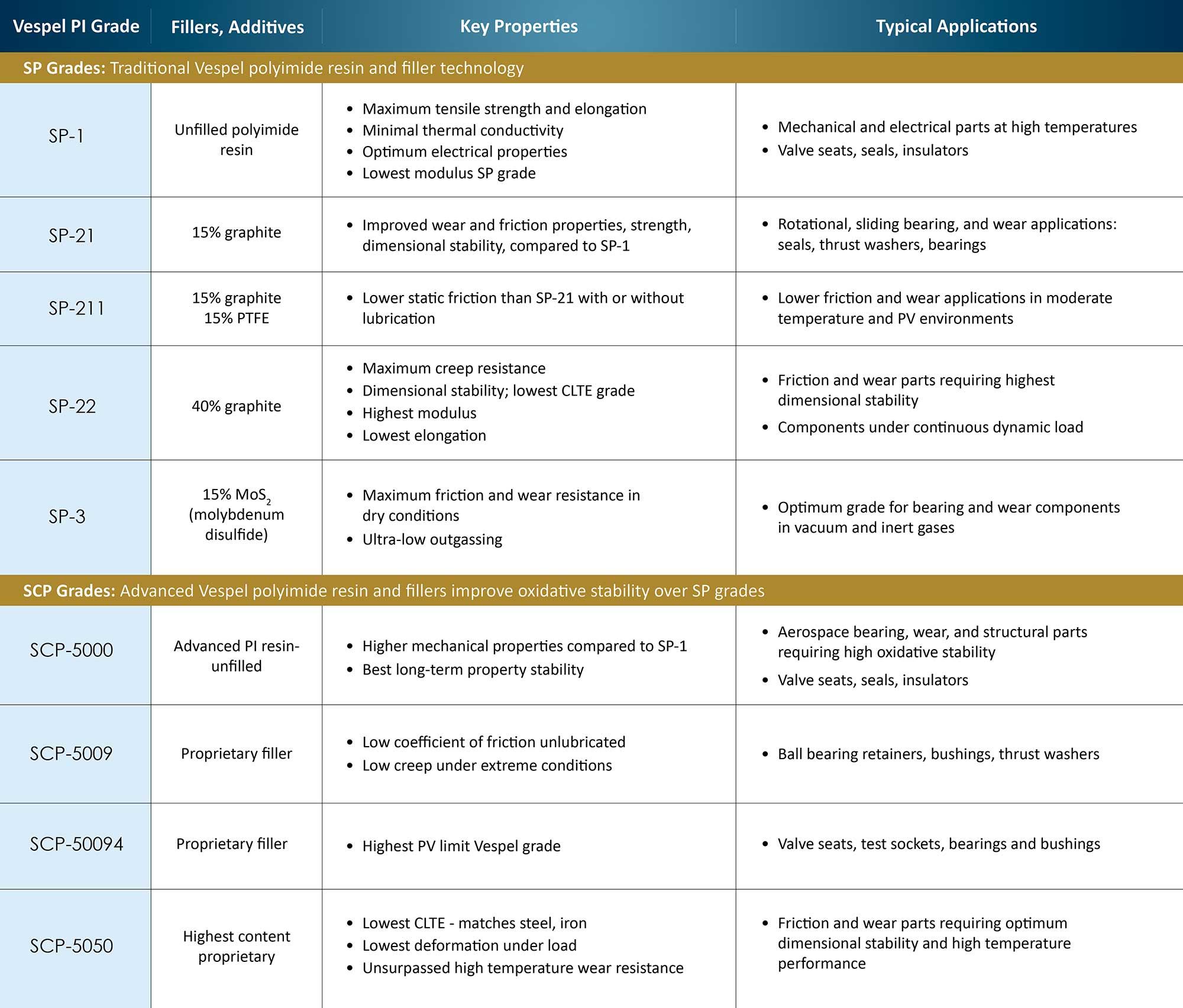 El espectro de Grades de Vespel® SP se ha ampliado a lo largo de 50 años para satisfacer los cambiantes requisitos de las aplicaciones. La línea de productos ofrece grados con diversas combinaciones y niveles de cargas que mejoran la resistencia, la estabilidad, las propiedades eléctricas y las características de fricción y desgaste del polímero básico Vespel® PI.